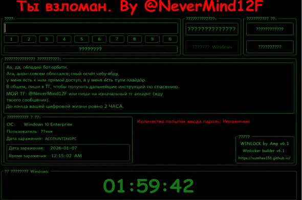GitHubから「WmiPrvSE.scr」をダウンロードして実行する。これは「Hakuna Matata」ランサムウェア(身代金要求型マルウェア)ファミリーから派生したもので、数百種類の拡張子をターゲットにファイルを暗号化する。暗号化されたファイルには「@NeverMind12F」という拡張子が付けられ、「ЧИТАЙМЕНЯ(私を読んで).txt」という名前の身代金要求のメモが残される。