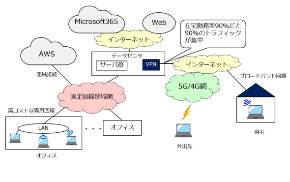 在宅勤務比率が90%だと、イントラネットのトラフィックの90%はVPNによるリモートアクセスになる。これまで多大な投資とランニングコストをかけて運用していたイントラネット本体は閑散とした状態になった。イントラネットの存在価値が10%に縮小した。