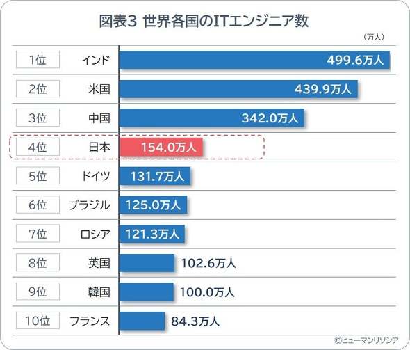 国別のITエンジニア数を見ると、1位はインドで499万6000人となった。インドは前回調査で米国を抜きトップになっており、今回もその座を維持した。2位は米国で439万9000人となり、インドとの差は前回調査の39.1万人から59.7万人に拡大している。3位には推計342万人の中国が入った。これら上位3カ国で、世界のITエンジニアの約4割強を占める結果になった。
