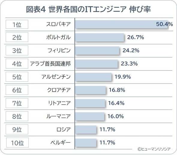 対前年の伸び率を国別で見ると、1位のスロバキア(50.4%増)、2位のポルトガル(26.7%増)、3位のフィリピン(24.2%増)といった国々が大きく伸長した。ウクライナと国境を接するスロバキアや、11位に入ったポーランドなど東欧諸国の上位ランクインが目立つ。この背景について同レポートでは、西欧のニアショア開発拠点としての需要や、ウクライナ情勢に伴う人材およびIT拠点の周辺国への避難・移転など、ビジネスや地政学的な要因による人材流動の影響が考えられるとしている。