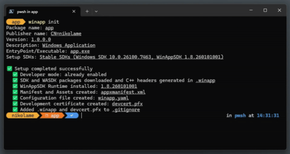 「init」コマンドを実行することで、ワークスペース全体のブートストラップが可能になる。必要なソフトウェア開発キット(SDK)パッケージのダウンロード、プロジェクションの生成、開発に向けたプロジェクト構成を自動化する。従来は手動で複数ステップを要していたマニフェストやアセットの作成、証明書の生成、依存関係の管理が、単一のコマンドで完結する。プロジェクトのルートディレクトリで「winapp init」を実行するだけで開始できる。