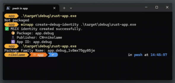 winappを使用すると、「winapp create-debug-identity my- app.exe」コマンド1つで実行ファイルにパッケージIDを追加できる。これにより、パッケージIDを必要とするコードのテストやデバッグにおいて、完全なパッケージ化をせずに最新APIのテストやデバッグが可能になる。