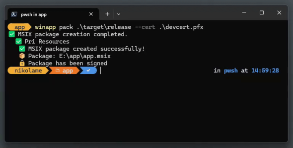 アプリをリリースする準備が整った際の「MSIX形式」へのパッケージ化もコマンド1つで実行可能だ。CLIがパッケージ化と署名のプロセスを処理し、ビルド出力からストア対応、サイドローディング対応のパッケージを生成する。