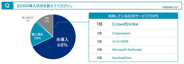 調査ではEDRの導入状況について、68%の企業が「未導入」と回答した。「導入済み」は19%、「導入検討中」は1%、「不明」は12%という結果となった。導入を検討している企業がわずか1%にとどまるなど、求められる対策と現場の実態との間に大きなギャップが存在することが明らかになった。