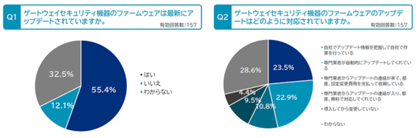ゲートウェイセキュリティ機器のファームウェア更新状況についての設問では、「最新にアップデートされている」と回答した企業は55.4%だった。一方で「いいえ」は12.1%、「分からない」は32.5%となり、半数近くの企業が最新の状態にしていない、あるいは把握していない実態が浮き彫りとなった。