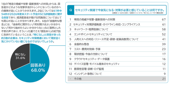 2026年度末ごろに経済産業省が開始する予定の「サプライチェーン強化に向けたセキュリティ対策評価制度」(SCS〈Supply Chain Security〉評価制度)に対する関心の高さがうかがえる結果となった。一方で、「全般的な懸念」を挙げた回答も6番目に多い結果となり、「何から始めたらよいか分からない」といった漠然とした不安の声が反映されているものと推測される。
