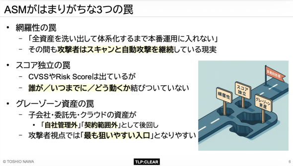 ASMで得られた情報が具体的な防御アクションに結び付いていない――。この機能不全を引き起こす要因として、名和氏は組織が陥りがちな「3つの“わな”」を指摘した。