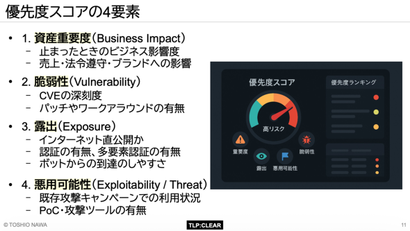 4つ目は悪用可能性(Exploitability/Threat)だ。脅威インテリジェンスに基づき、攻撃キャンペーンで利用されているかどうか、攻撃ツールが存在するかどうかといった、現実的な危険度を評価する。