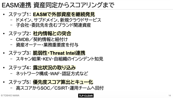 理想的なワークフローは、EASM(External Attack Surface Management:外部攻撃対象領域管理)による外部資産の“継続的な”発見から始まる。発見された資産は社内情報と突き合わされ、オーナーや業務上の重要度が自動付与される仕組みを作る。