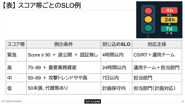 中でも決定的に重要なのが、スコア帯ごとのSLO設定だ。名和氏は「スコア90以上の『緊急』なら、4時間以内に封じ込め」「スコア70〜89の『高』なら、24時間以内に封じ込め」といった例を挙げる。