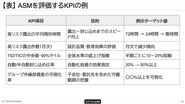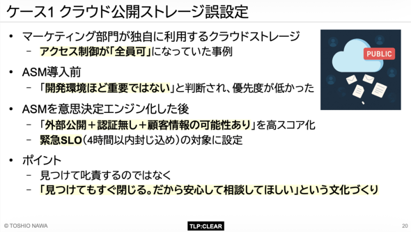 ASMの意思決定エンジン化の後、この資産は「外部公開+認証なし+顧客情報の可能性」という条件から自動的に極めて高いスコアが付与され、「緊急SLO(4時間以内)」の対象になった。発見後、即座にアクセス権が修正された。名和氏は、「『見つけて叱責(しっせき)する』のではなく『見つけてもすぐ閉じる。だから安心して相談してほしい』という文化作りが大切だ」と、技術だけでなく文化の重要性を説く。