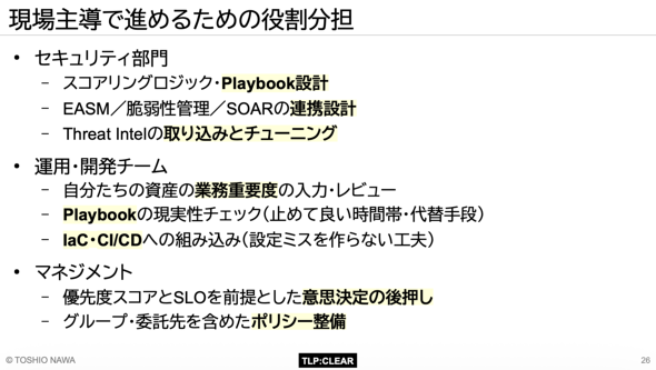 この取り組みを成功させるには、明確な役割分担が不可欠だ。セキュリティ部門がスコアリングロジックやPlaybookを設計する。運用/開発チームがその現実性を検証する。マネジメント層が優先度スコアとSLOに基づく迅速な意思決定を後押しし、ポリシーを整備する。