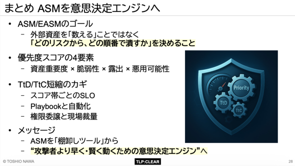 ASM/EASMの真のゴールは、資産を「数える」ことではない。「どのリスクから、どの順番でつぶすか」を、攻撃者よりも速く、そして賢く決めることにあると名和氏はまとめる。この変革には、資産重要度、脆弱性、露出、悪用可能性という4要素による客観的なリスク評価、TtD/TtCの徹底的な短縮を駆動するSLOと自動化、明確なルールに基づき迅速な意思決定を可能にする現場への権限委譲がポイントだ。