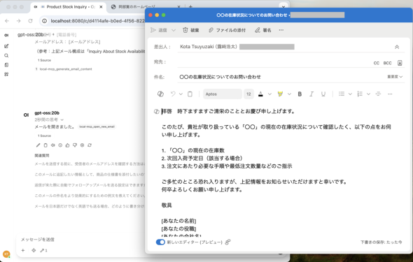 生成された内容がOutlookの新規メールとして開いたでしょうか? 開くことができれば成功です。このように、チャット経由で任意のローカル操作を実現できます。