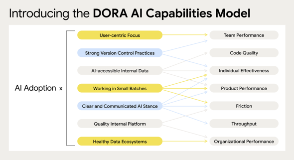 開発の生産性向上とAIツールの導入が、必ずしもイコールにならない実態については、Googleが約5000人を対象に実施した調査結果をまとめたレポート「DORA AI Capabilities Model」でも触れられている。同レポートは、AI支援による開発が一律に生産性を押し上げるわけではなく、既存の組織能力やプロセス設計の違いによって、その効果に差が生じることを示している。