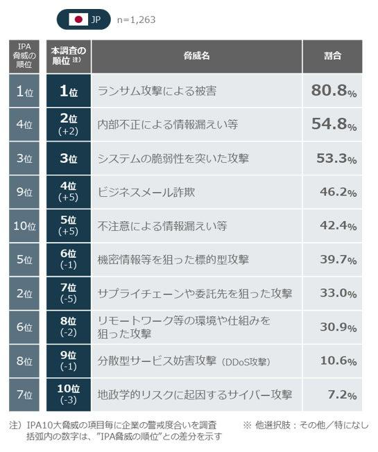 情報処理推進機構(IPA)が公表した「情報セキュリティ10大脅威2025 組織編」を基に日本企業の警戒度を調査したところ、1位は「ランサム攻撃による被害」(80.8%)で一致していたが、2位以下で差が見られた。