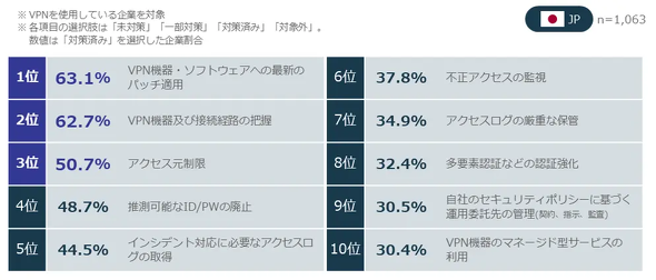 加えて「最新のパッチ(修正プログラム)適用」を完了している企業は63.1%にとどまり、4割近くの企業がVPN機器の脆弱(ぜいじゃく)性を放置している恐れがある。