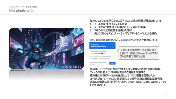 「インフォスティーラーの爆発的な普及は、サイバー攻撃者の戦略に本質的な変化をもたらした」と西尾氏。本講演で最も強調したのが、攻撃経路のパラダイムシフトだ。