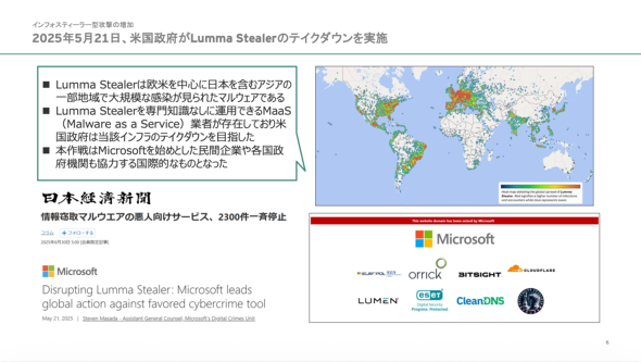 このエコシステムの強靭(きょうじん)さを物語る例として、西尾氏は2025年5月に米国政府主導で行われたLumma Stealerインフラに対する大規模なテイクダウン作戦の“その後”を紹介する。この国際的な共同作戦では2300件以上のサーバが押収されたものの、その効果は限定的だった。西尾氏は、「翌日には当該MaaSは復旧し、新たに被害端末から収集した情報の販売が再開され、ほぼノーダメージだったのではないかと言われている」と指摘する。