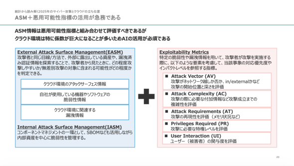 クラウド環境の複雑性を踏まえると、従来のASMのように単に脆弱性や設定ミスをリストアップするだけでは不十分だ。そこで重要になるのが、「External Attack Surface Management」(EASM)によって得られた外部から見えるアタックサーフェスの情報と、「悪用可能性指標」(Exploitability Metrics)を掛け合わせて評価するアプローチだ。