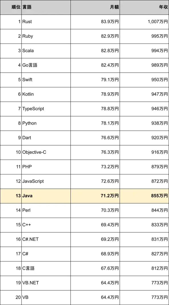 同レポートによると、Java案件の平均月額単価は71.2万円、平均年収は855万円だった。プログラミング言語別の年収ランキングでは13位に位置している。一方で、案件の占有率は市場全体の18.67%を占め、案件数ランキングでは1位となっている。