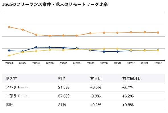 2026年2月時点のJava向けフリーランス案件におけるテレワーク比率は、フルリモートが21.5%、一部リモートが57.5%、常駐が21%で、フルリモートと一部リモートを合わせると79%に達している。前月比ではフルリモートが0.5%増加し、一部リモートが0.8%減少した。