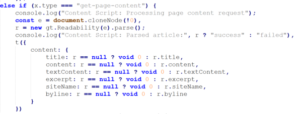 iframeからの指示に応じて、拡張機能はユーザーが現在閲覧しているページのタイトルやテキスト、メタデータなどを抽出する。これは、Mozillaの「Readability」ライブラリを悪用したもので、抽出されたデータ(タイトル、テキストコンテンツ、抜粋、サイトメタデータなど)はそのまま外部のiframeに送り返される。