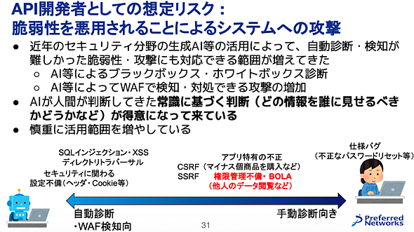 これらの点については、「脆弱性診断をするのが一番根本的な対策だ」と汐田氏は述べる。PFNでは新規のプログラムや重要な新機能、大きな変更を施すときは、脆弱性診断を行うように促しているという。自動化に関しても生成AIの力が有効になりつつあるが、「基本的に手動でやる」とした。加えて依存ソフトウェアの可視化として、SBOMが取れるCSPM(Cloud Security Posture Management)、CNAPP(Cloud-native Application Protection Platform)を活用し、脆弱性のニュースに即時対応できるようにしている。WAFおよび自動診断は補助的な利用となっているという。