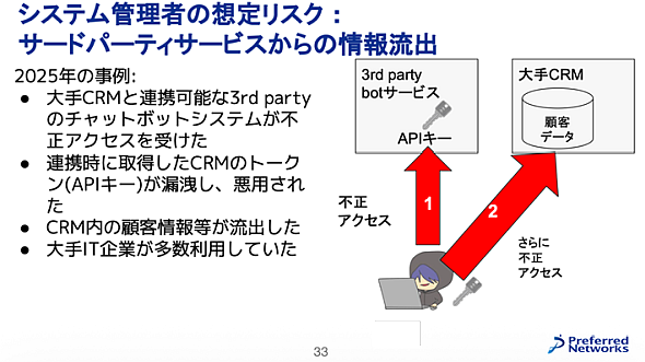 サードパーティー連携における最大のリスクは、自社のコントロールが及ばない領域でインシデントが発生することにある。2025年の大手ソフトウェア関連インシデントにおいても、連携先のサードパーティー製ボットサービスが踏み台となり、API経由で機密データが盗み出されるなど、連鎖的な攻撃が常態化している。