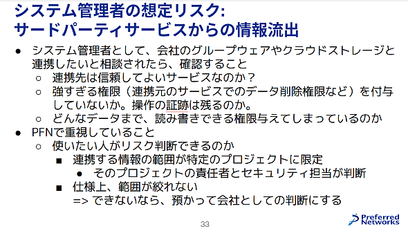 ここで汐田氏は「判断主体の適切性」を指摘する。「プロジェクト単位の認可」で済む範囲を超え、全社のデータにアクセス可能な「全社権限の認可」を求める連携であれば、現場のプロジェクトマネージャーではなく、経営層や全社管理部門がリスクを判断すべきだと述べる。