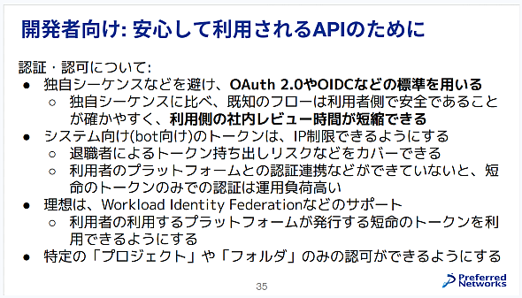汐田氏は「認可する範囲に対して、リスク判断する人が適切かどうか」を軸に、権限のスコープと判断主体の不一致を防ぐ重要性を強調する。また、技術的な理想形として、固定のAPIキーを排除し、「Workload Identity Federation」のような短命トークン交換方式をサポートすることを開発側に推奨する。これにより、クレデンシャル管理という属人的なリスクを排除し、システム的に安全な認可プロセスを確立できる。さらに、独自仕様の認証シーケンスを避け、OAuth 2.0やOIDC(OpenID Connect)といった標準規格を採用することで、第三者によるレビューや監査を容易にすることも、管理・ガバナンスの観点から極めて重要である。