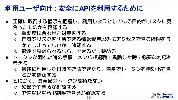 利用者においても、正確にどのような権限をそのAPIが持っているのか、今行おうとしている自動化が会社を危機にさらすことにならないかといったバランス感覚が必要となる。