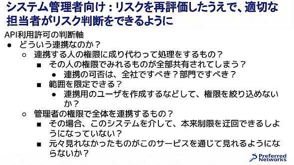 システム管理者は、APIの利用許可を出すに当たり、どういう連携か、監査ログが十分に出力されるか、連携はこちらから確実に取り消せるか、相手は信頼できるかといった視点を持ち、適切な担当者がリスクを判断できるようにする必要がある。