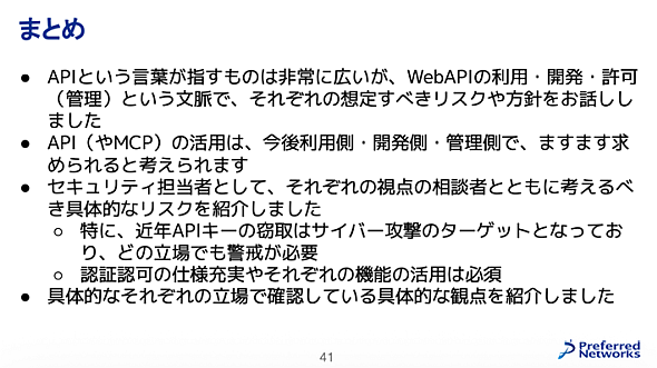汐田氏は「APIの利用は今後ますます求められてくる」と述べる。APIキーは狙われるものと考えること、開発側も脆弱性を公開前に発見し修正、WAFで緩和していくこと。システム管理者は許可する範囲が判断する人と合っているのかに注意すること。