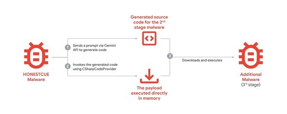 GTIGは2025年9月、Gemini APIを用いてC#ソースコードを動的に生成するダウンローダ型マルウェア「HONESTCUE」を発見した。生成されたコードは第2段階の機能を実行し、これによって第3段階のマルウェアがダウンロードされ、実行される。HONESTCUEの主な特徴は以下の通り。