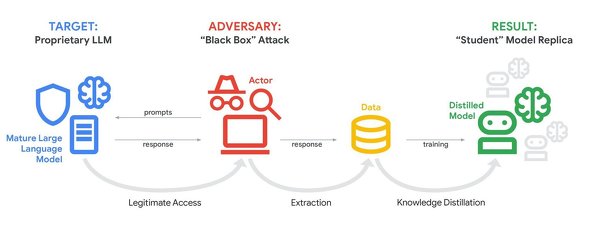 GTIGとGoogleのAI研究部門Google DeepMindは2025年を通じて、AIモデルの能力を不正に複製しようとする「モデル抽出攻撃」(「蒸留攻撃」)が増加していることを確認した。攻撃者が正規のAPIアクセスによってモデルに大量のクエリを送り、その応答から内部ロジックやリーズニングプロセスを模倣した「生徒モデル」を構築するものだ。