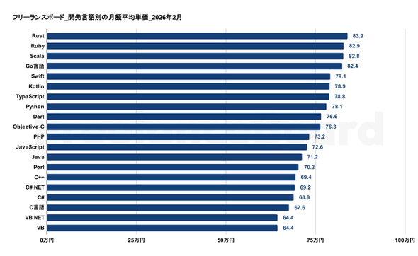 開発言語別で見ると、月額平均単価の多くが2026年1月と比較して上昇傾向を示した。最も単価が高い開発言語は「Rust」の83.9万円(前月比0.6万円増)で、2位は「Ruby」で82.9万円(前月比0.2万円増)、3位は「Scala」で82.8万円(前月比0.8万円増)となった。前年同月と比べた月額平均単価の変動では、「C++」が6.2万円増、「Go言語」が3.9万円増と上昇幅が大きかった。「Ruby」などの月額単価は直近4カ月間、「Go言語」などの月額単価は直近5カ月間連続で上昇している。
