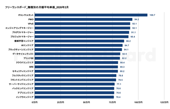 エンジニア向けのインターネット求人サービスを展開するINSTANTROOMは2026年2月12日、案件検索サイト「フリーランスボード」における、2026年2月のフリーランス案件の単価に関する市場動向の調査結果を発表した。
