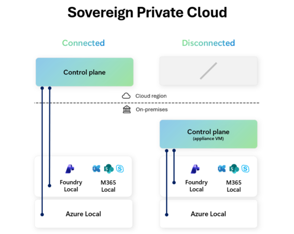 Sovereign Private Cloudは、ハイパーコンバージドインフラ(HCI)製品「Azure Local」(旧「Azure Stack HCI」)、プライベートクラウド向けオフィススイート「Microsoft 365 Local」、ローカルAI推論ソリューション「Foundry Local」を組み合わせ、クラウド接続や断続的接続、切断のいずれの状態でも一貫した運用を可能にするものだ。