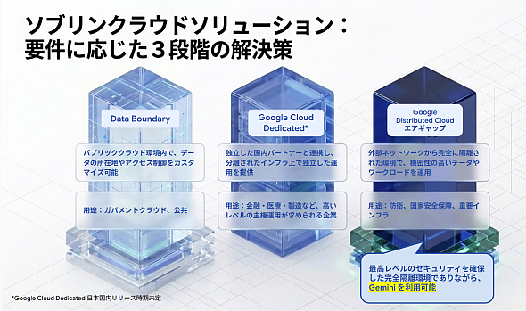 グーグルクラウドジャパンは2026年3月下旬に実施した説明会で、今後パートナーとともに取り組む3つの事業機会の一つに「ソブリン需要」を挙げた。この需要に対応するため、Google CloudのAIサービスを活用しながらユーザー側が厳格な制御を行えるよう、「ソブリンクラウド」で複数の選択肢を提供する。