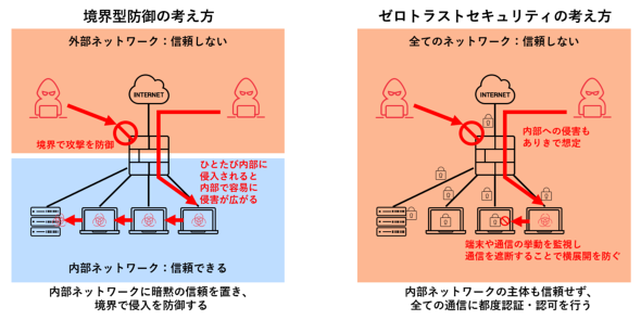 従来型の境界型防御の構成では、社内ネットワークを「信頼されたネットワーク」と見なし、ファイアウォールなどのセキュリティ機器で守られた境界の外側のネットワークを「信頼されないネットワーク」と見なします。こうして内側と外側のネットワークを分離してその境界において攻撃者の侵入を防ぐ構成は、ネットワークの境界で完全に侵入を防ぐことができれば有効です。