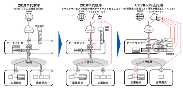 こうした変化の結果として、従来のように組織の内外の境界をデータセンターとインターネットの間に置くことが難しくなり、境界型防御の構成を取った場合には、ネットワーク上で外部からの侵入を考慮すべきポイントが増えました。また、2019年ごろから流行したCOVID-19(新型コロナウイルス感染症)によって、出社が禁止されテレワークが増えたことで、境界型防御の考え方において内部の信頼されたネットワークにあるべき端末が従業員の自宅などの組織の外部に配置されることになり、既存の境界型防御の構成が有効に働かない状況が発生しました。