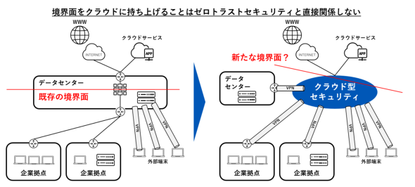 「SASE」(Secure Access Service Edge)や「SSE」(Secure Service Edge)などのクラウド型のセキュリティを導入するだけでゼロトラストセキュリティを実現したように誤解する場合があります。場合によってはオンプレミスのプロキシサーバやファイアウォールをクラウド型のプロキシサーバやファイアウォールに変えただけで「ゼロトラストを実現した」と誤解して、結果として単に境界型防御の境界をサービス上に持ち上げただけで、境界型防御の考え方そのものを維持している場合があります(図3)。