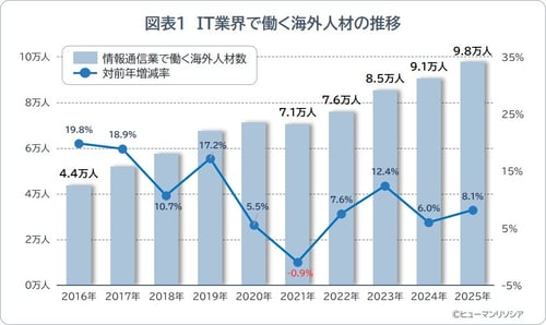 IT業界の総就業者数の増加が直近10年で約1.5倍にとどまる中、海外人材は約2.2倍に拡大しており、今や「安定的な人材供給源の一つ」となっていることがうかがえる。