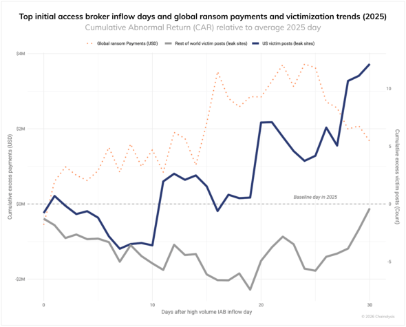 ランサムウェア攻撃は単独で行われるのではなく、侵入済みネットワークへのアクセスを販売するIAB(Initial Access Broker)など、複数の犯罪者による分業体制に支えられている。2025年には、こうしたIABに対して少なくとも1400万ドルの支払いがブロックチェーン上で確認されている。レポートによると、IABへの支払いが急増した約30日後には、ランサムウェアの被害額とリークサイトへの米国企業の掲載件数のいずれも増加していたという。