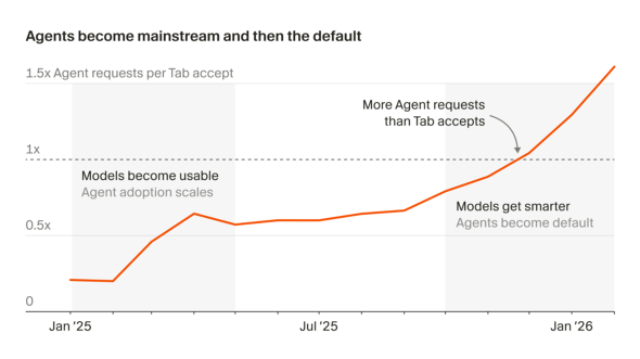 Cursorにおける利用統計は、この移行の速度を示している。2025年3月時点では、Tab補完を主に利用するユーザーは、エージェントのユーザーの約2.5倍だった。現在はその比率が逆転し、エージェントのユーザーはTabユーザーの2倍となっている。過去1年でCursorにおけるエージェントの利用は15倍以上に増加したという。