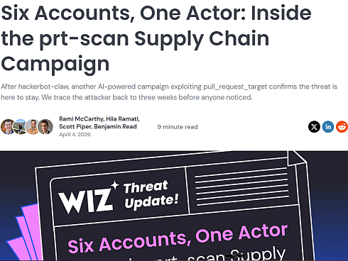 セキュリティ企業Wiz Cloudによると、「prt-scan」と名付けられた今回のキャンペーンは単体の事案ではない。攻撃は2026年3月11日に始まった。6つのアカウントを使い分け、6回にわたって段階的に実行された。合計で500以上の不正PRが送られたという。