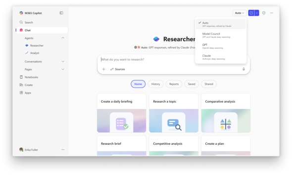 Researcherのデフォルト機能「Critique」は、AnthropicやOpenAIなどのフロンティアモデルを組み合わせ、生成と評価を分離する。1つのモデルがタスクの計画と初稿を作成し、別のモデルが専門家レビュワーとして改善を行ってから最終レポートを生成する。Researcherのモデル選択で「自動」を選択した場合に利用できる。