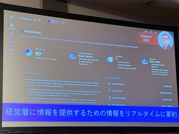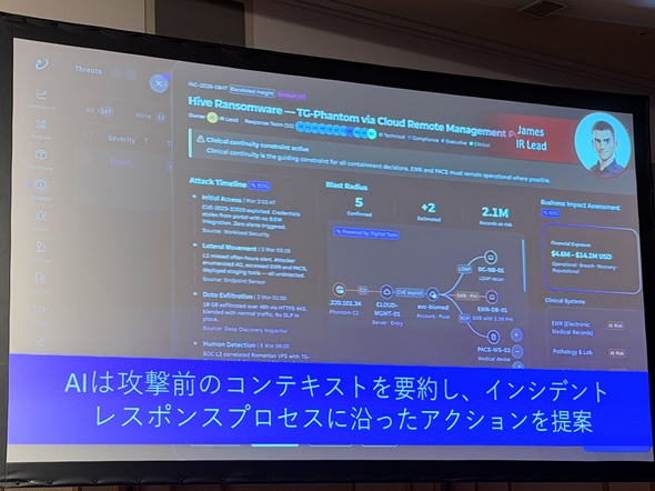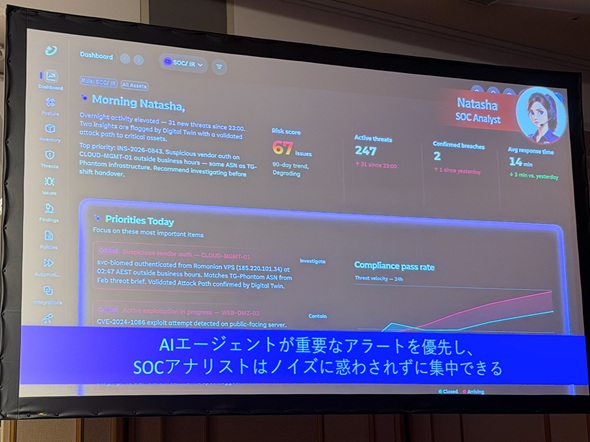 生成AIによってエンタープライズのセキュリティはどう変化するか。TrendAIが提供する脅威ダッシュボードを見ながら、より踏み込んでいこう。例えばSOCアナリストが朝出勤すると、AIが重要なアラートをダッシュボードにまとめている。これを見るだけでノイズに惑わされずに対処できる。