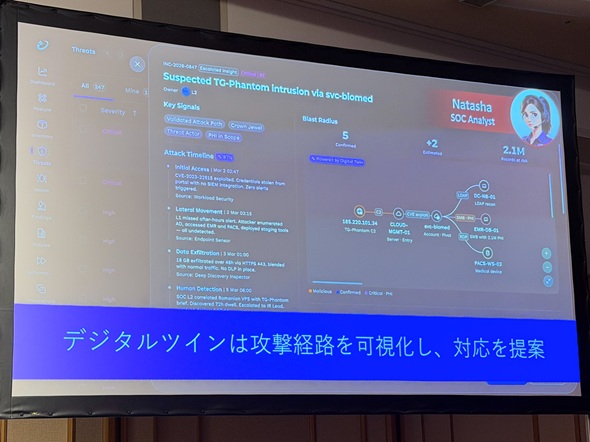 重要なアラートの中には、どうやら対処が必要な情報が含まれていたようだ。このダッシュボードはデジタルツイン技術を使ってシステムの状況を可視化している。これに加えて、攻撃に頻繁に使われる脆弱性の情報を基に、攻撃経路を予測する。これによって被害発生前にプロアクティブにリスク軽減措置が取れるわけだ。